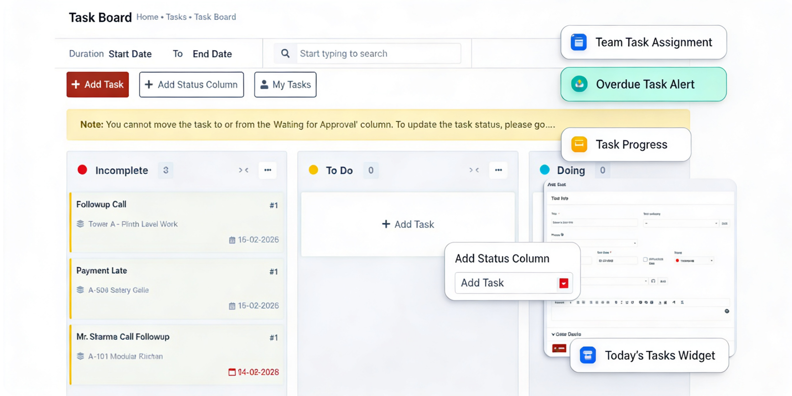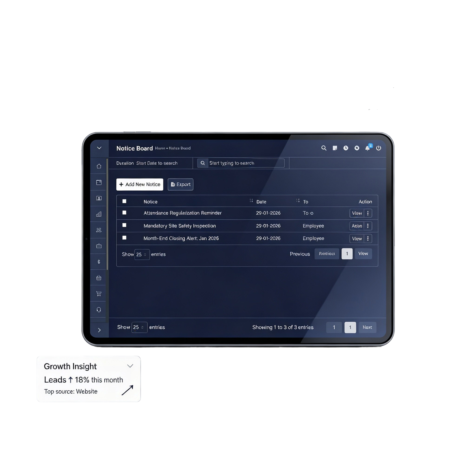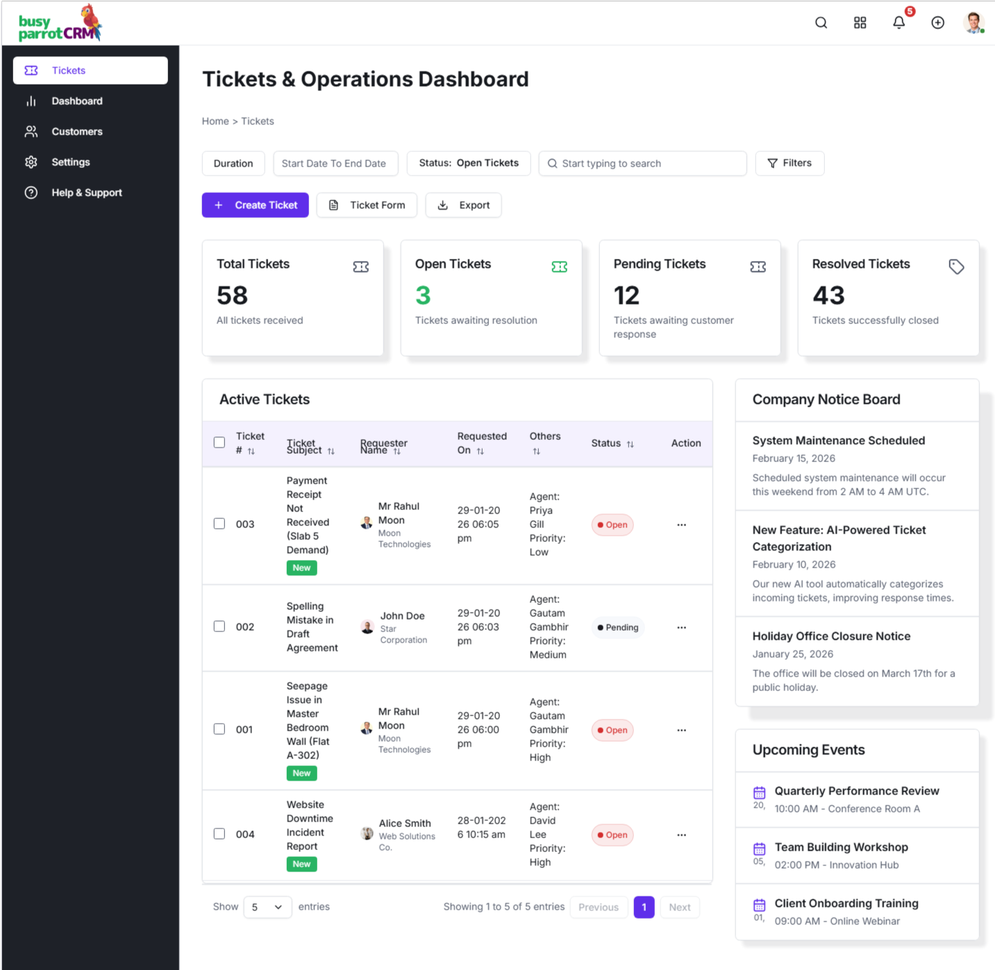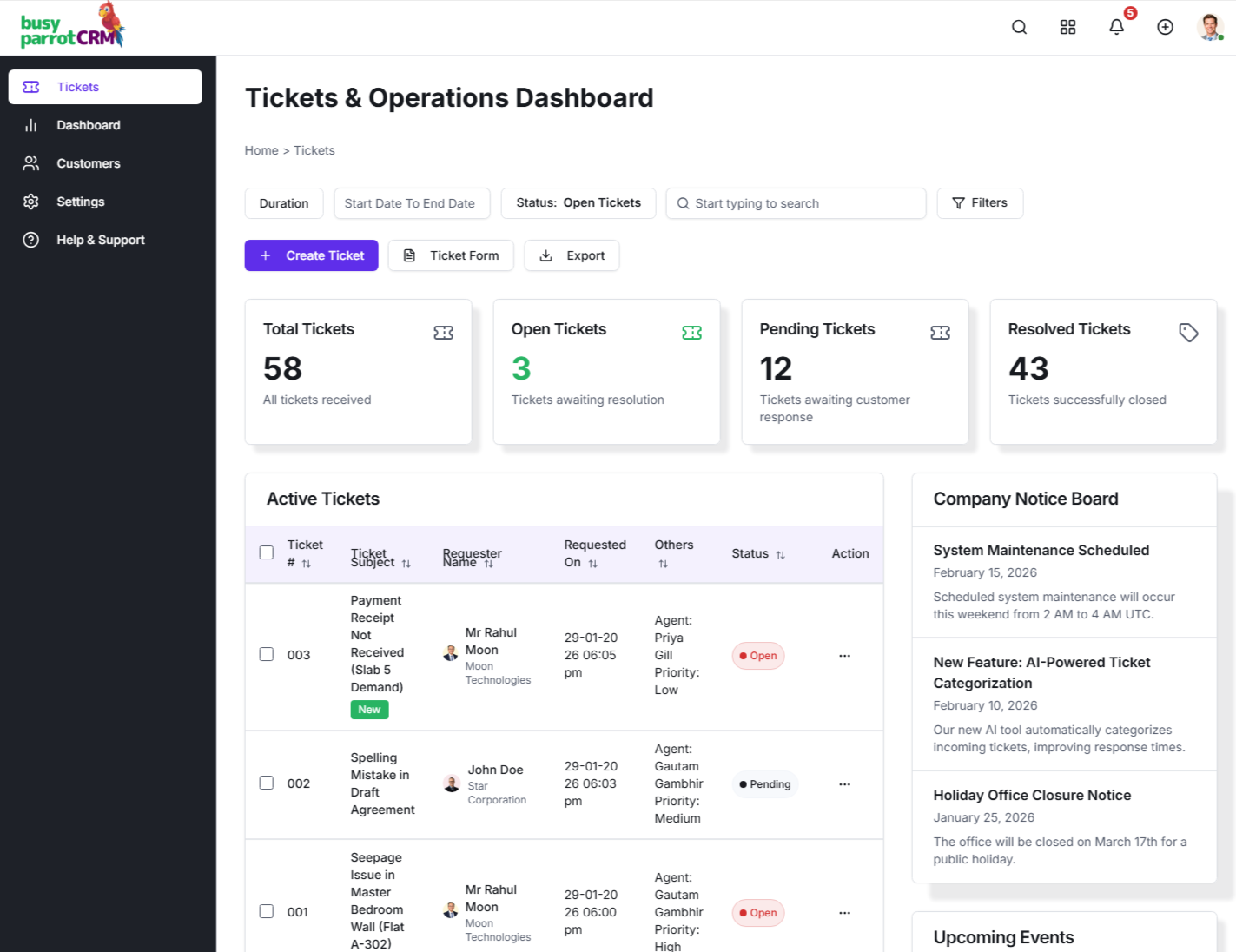 Keep daily operations organized with ticket management, document expiry tracking, calendars, and internal notices – all in one system.