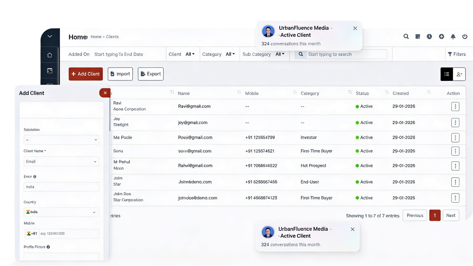 Stop jumping between apps. Sync your WhatsApp, Email, and Phone logs directly into the client’s profile. See every conversation in one timeline.